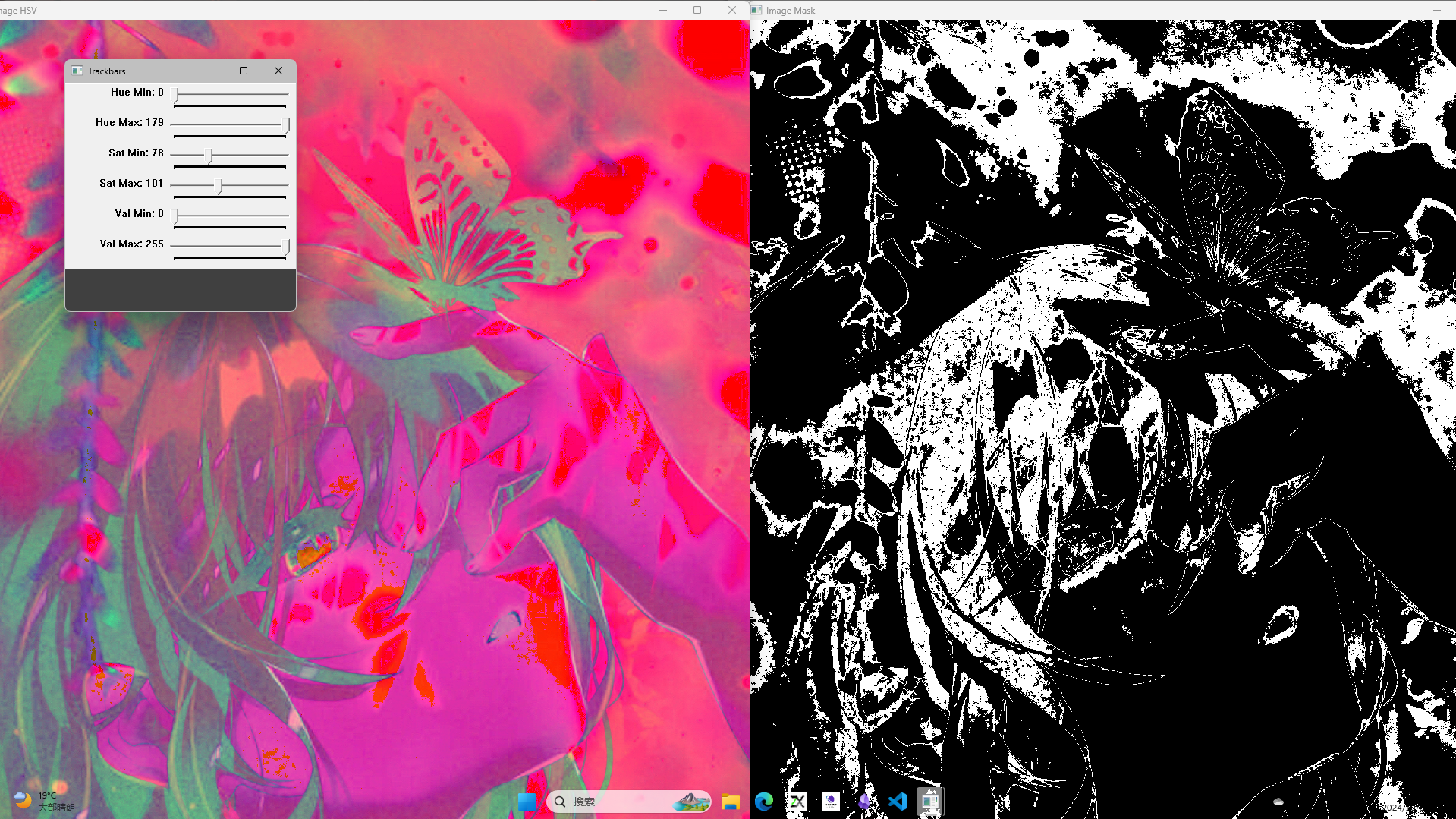 | #include <opencv2/imgcodecs.hpp> #include <opencv2/highgui.hpp> #include <opencv2/imgproc.hpp> #include <iostream> using namespace cv; using namespace std; Mat imgHSV, mask; int hmin = 0, smin = 110, vmin = 153; int hmax = 19, smax = 240, vmax = 255; int main() { string path = "../lesson1_pictureRead/img1.jpg"; Mat img = imread(path); cvtColor(img, imgHSV, COLOR_BGR2HSV); namedWindow("Trackbars", (640, 200)); createTrackbar("Hue Min", "Trackbars", &hmin, 179); createTrackbar("Hue Max", "Trackbars", &hmax, 179); createTrackbar("Sat Min", "Trackbars", &smin, 255); createTrackbar("Sat Max", "Trackbars", &smax, 255); createTrackbar("Val Min", "Trackbars", &vmin, 255); createTrackbar("Val Max", "Trackbars", &vmax, 255); while (true) { Scalar lower(hmin, smin, vmin); Scalar upper(hmax, smax, vmax); inRange(imgHSV, lower, upper, mask); imshow("Image", img); imshow("Image HSV", imgHSV); imshow("Image Mask", mask); waitKey(1); } return 0; }