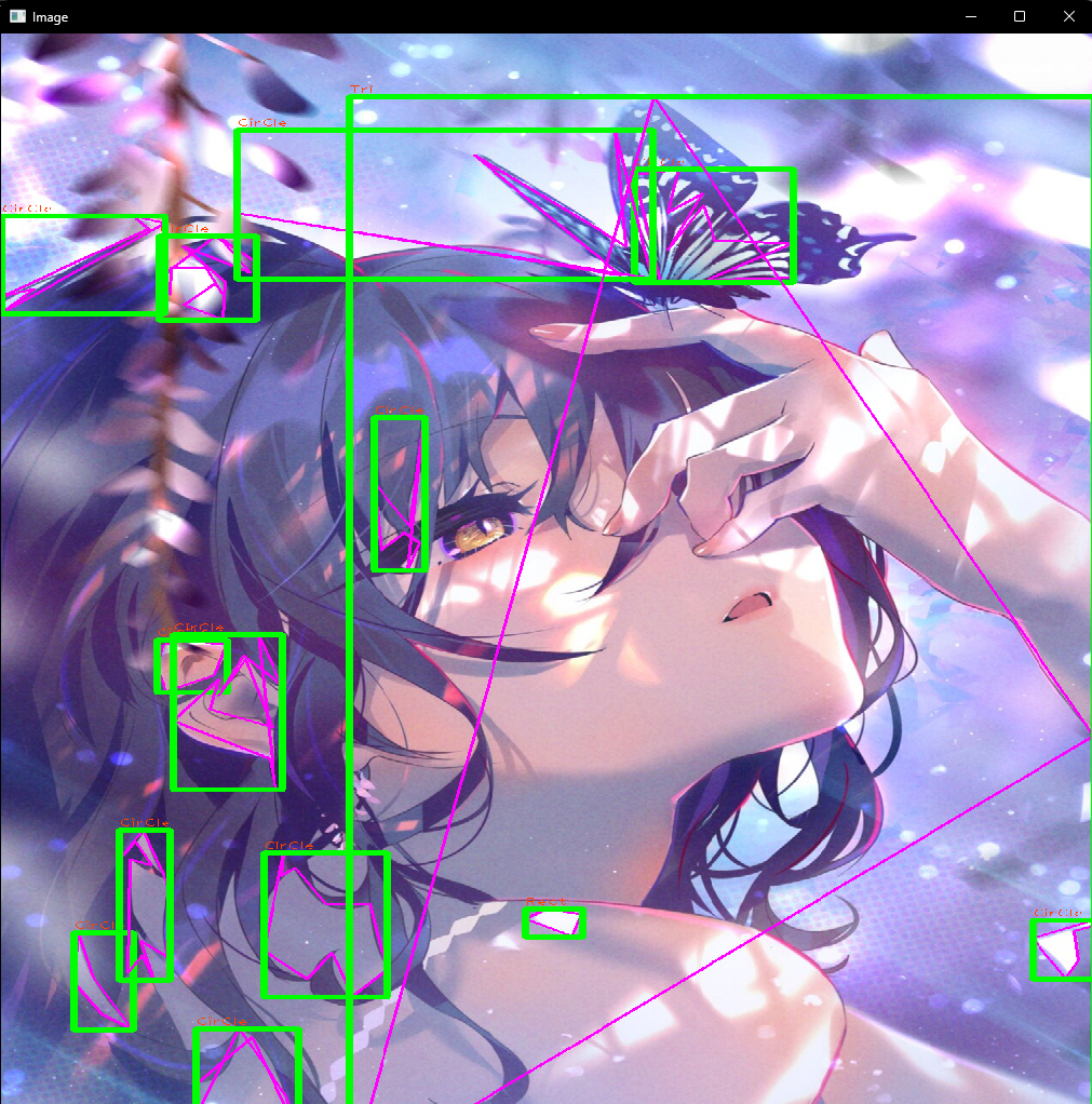 drawContours(img, conPoly, i, Scalar(255, 0, 255), 2); rectangle(img, boundRect[i].tl(), boundRect[i].br(), Scalar(0, 255, 0), 5); putText(img, objectType, { boundRect[i].x, boundRect[i].y - 5 }, FONT_HERSHEY_PLAIN, 1, Scalar(0, 69, 255), 1); } } }